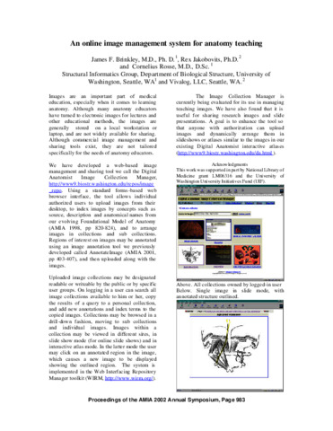 Brinkley, James F and Jakobovits, Rex M and Rosse, Cornelius (2002) An Online Image Management System for Anatomy Teaching. In: American Medical Informatics Association Fall Symposium. p. 983.