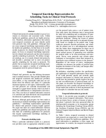 Weng, C. and Kahn, M. and Gennari, John H (2002) Temporal Knowledge Representation for Scheduling Tasks in Clinical Trial Protocols. In: American Medical Informatics Association Fall Symposium. pp. 879-883.