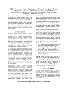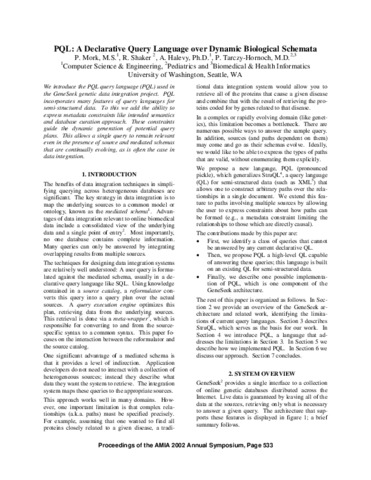 Mork, Peter and Shaker, R. and Halevy, A. and Tarczy-Hornoch, Peter (2002) PQL: A Declarative Query Language over Dynamic Biological Schemata. In: American Medical Informatics Association Fall Symposium. pp. 533-537.