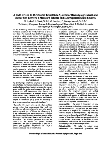 Shaker, R. and Mork, Peter and Barclay, M. and Tarczy-Hornoch, Peter (2002) A Rule Driven Bi-Directional Translation System for Remapping Queries and Result Sets Between a Mediated Schema and Heterogeneous Data Sources. In: American Medical Informatics Association Fall Symposium. pp. 692-696.