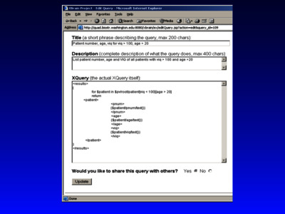 This paper discusses an approach to exporting relational data in XML format for data exchange over the web. We describe the first real-world application of SilkRoute, a middleware program that dynamically converts existing relational data to a user-defined XML DTD. The application, called XBrain, wraps SilkRoute in a Java Server Pages framework, thus permitting a web-based XQuery interface to a legacy relational database. The application is demonstrated as a query interface to the University of Washington Brain Project s Language Map Experiment Management System, which is used to manage data about language organization in the brain.