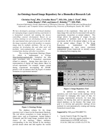 Fong, Christine and Rosse, Cornelius and Clark, J. I. and Shapiro, Linda G and Brinkley, James F (2004) An Ontology-based Image Repository for a Biomedical Research Lab. In: MedInfo 2004. p. 1598.