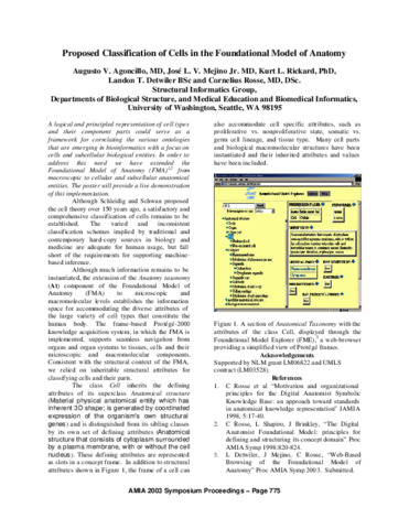 Agoncillo, Augusto V and Mejino, Jose L V and Rickard, K. L. and Detwiler, Landon T and Rosse, Cornelius (2003) Proposed Classification of Cells in the Foundational Model of Anatomy. In: American Medical Informatics Association Fall Symposium. p. 775.