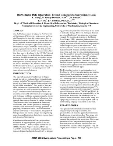 Wang, Kelan and Tarczy-Hornoch, Peter and Shaker, Ron and Mork, Peter and Brinkley, James F (2005) BioMediator data integration: beyond genomics to neuroscience data. In: American Medical Informatics Association Fall Symposium. pp. 779-783.