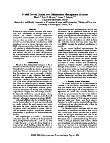 Li, Hao and Gennari, John H and Brinkley, James F (2006) Model Driven Laboratory Information Management Systems. In: American Medical Informatics Association Fall Symposium. pp. 484-488.