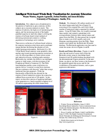 Warren, Wayne and Agoncillo, Augusto V and Franklin, Joshua D and Brinkley, James F (2006) Intelligent web-based whole body visualization for anatomy education. In: American Medical Informatics Association Fall Symposium. p. 1136.
