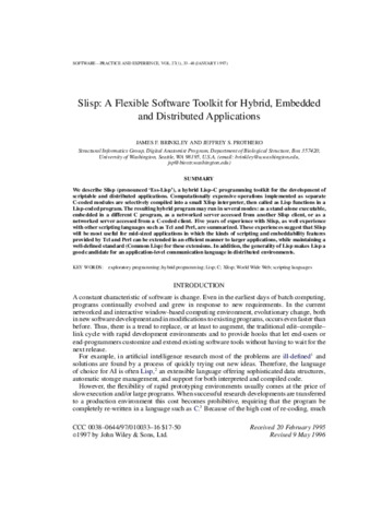 Brinkley, James F and Prothero, J. S. (1997) Slisp: A Flexible Software Toolkit for Hybrid, Embedded and Distributed Applications. Software -- Practice and Experience, 27 (1). pp. 33-48.