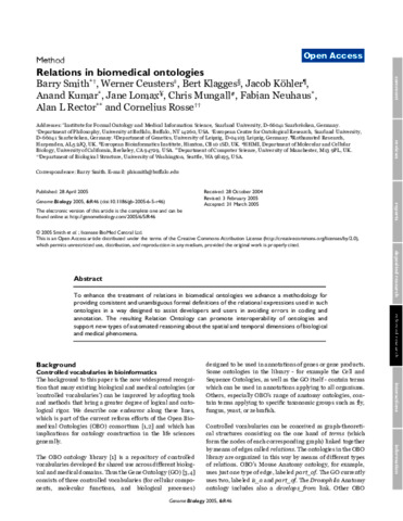 Smith, Barry and Ceusters, Werner and Klagges, Bert and Köhler, Jacob and Kumar, Anand and Lomax, Jane and Mungall, Chris and Neuhaus, Fabian and Rector, Alan L and Rosse, Cornelius (2005) Relations in biomedical ontologies. Genome Biology, 6 (5). pp. R46.1-R46.15.