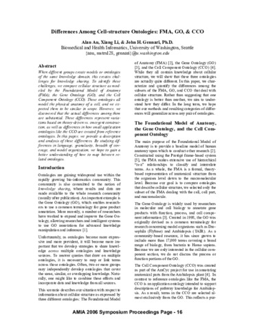 Au, Alan and Li, Xiang and Gennari, John H (2006) Differences Among Cell-structure Ontologies: FMA, GO, & CCO. In: Proceedings, Annual Fall Symposium of the American Medical Informatics Association. pp. 16-20.