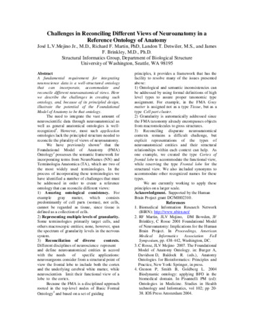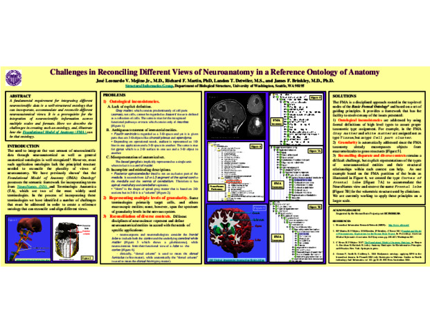 Mejino, Jose L V and Martin, Richard F and Detwiler, Landon T and Brinkley, James F (2007) Challenges in Reconciling Different Views of Neuroanatomy in a Reference Ontology of Anatomy. In: American Medical Informatics Association Fall Symposium. p. 1046.
