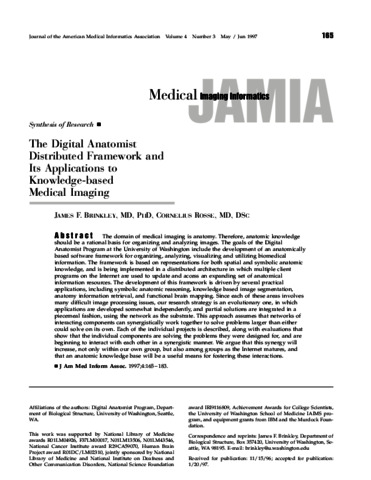 Brinkley, James F and Rosse, Cornelius (1997) The Digital Anatomist Distributed Framework and Its Applications to Knowledge Based Medical Imaging. Journal of the American Medical Informatics Association, 4 (3). pp. 165-183.
