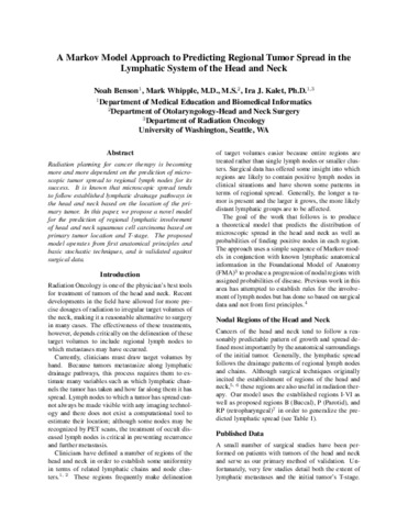 Benson, Noah and Whipple, Mark and Kalet, Ira J (2006) A Markov Model Approach to Predicting Regional Tumor Spread in the Lymphatic System of the Head and Neck. In: American Medical Informatics Association Fall Symposium. pp. 31-35.