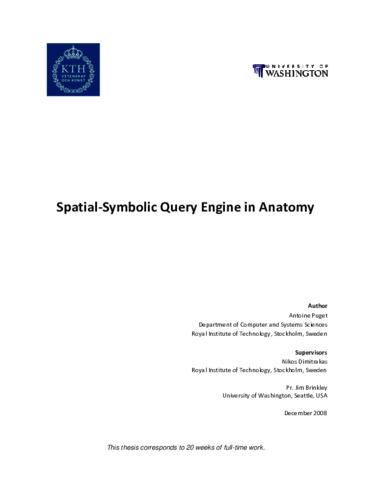 Puget, Antoine (2008) Spatial-Symbolic Query Engine in Anatomy. Masters thesis, Royal Institute of Technology, Stockholm, Sweden.