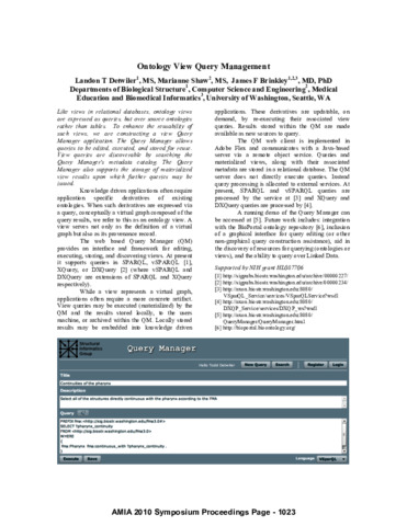 Detwiler, Landon T and Shaw, Marianne and Brinkley, James F (2010) Ontology View Query Management. In: Annual Symposium of the American Medical Informatics Association. p. 1023.