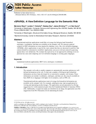 Shaw, Marianne and Detwiler, Landon T and Noy, N. F. and Brinkley, James F and Suciu, Dan (2011) vSPARQL: A View Definition Language for the Semantic Web. Journal of Biomedical Informatics, 44 (1). pp. 102-117.