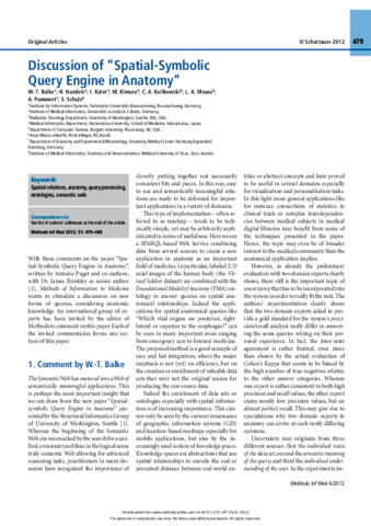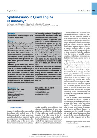 Puget, A. and Mejino, J. L. V. and Detwiler, L. T. and Franklin, J. D. and Brinkley, James F (2012) Spatial-symbolic Query Engine in Anatomy. Methods of Information in Medicine, 51 (6). pp. 463-478. ISSN 0026-1270