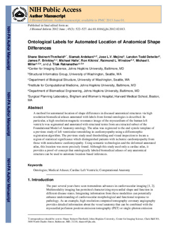 Steinert-Threlkeld, Shane and Ardekani, Siamak and Mejino, Jose L.V. and Detwiler, Landon Todd and Brinkley, James F and Halle, Michael and Kikinis, Ron and Winslow, Raimond L. and Miller, Michael I. and Ratnanather, J. Tilak (2012) Ontological labels for automated location of anatomical shape differences. Journal of Biomedical Informatics, 45 (3). pp. 522-527. ISSN 15320464