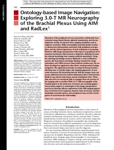 or characterize abnormalities associated with peripheral neuropa- thies, and the clinical importance of such techniques is increasing. However, MR image interpretation with respect to peripheral nerve anatomy and disease often presents a diagnostic challenge because the relevant knowledge base remains relatively specialized. Using the radiology knowledge resource RadLex®, a series of RadLex queries, the Annotation and Image Markup standard for image annotation, and a Web services–based software architecture, the au- thors developed an application that allows ontology-assisted image navigation.The application provides an image browsing interface, allowing users to visually inspect the imaging appearance of ana- tomic structures. By interacting directly with the images, users can access additional structure-related information that is derived from RadLex (eg, muscle innervation, muscle attachment sites).These data also serve as conceptual links to navigate from one portion of the imaging atlas to another.With 3.0-T MR neurography of the brachial plexus as the initial area of interest, the resulting applica- tion provides support to radiologists in the image interpretation process by allowing efficient exploration of the MR imaging appear- ance of relevant nerve segments, muscles, bone structures, vascular landmarks, anatomic spaces, and entrapment sites, and the investi- gation of neuromuscular relationships.