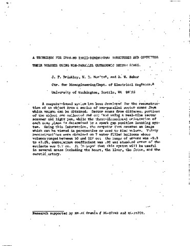 Brinkley, James F and Moritz, W. E. and Baker, D. W. (1978) A Technique for Imaging Three-Dimensional Structures and Computing their Volumes Using Non-Parallel Ultrasonic Sector Scans. In: Ultrasound in Medicine. Springer, Boston pp. 471-474.