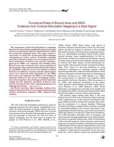Corina, David P and McBurney, S. L. and Dodrill, C. and Hinshaw, Kevin P and Brinkley, James F and Ojemann, George A (1999) Functional Roles of Broca's Area and SMG: Evidence from Cortical Stimulation Mapping in a Deaf Signer. Neuroimage, 10 (5). pp. 570-581.
