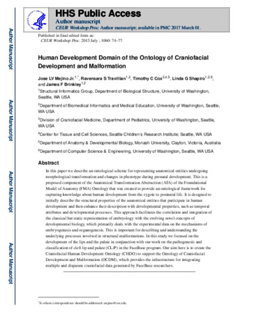 Mejino, Jose Lv and Travillian, Ravensara S and Cox, Timothy C and Shapiro, Linda G and Brinkley, James F (2013) Human Development Domain of the Ontology of Craniofacial Development and Malformation. In: Proceedings, 4th International Conference on Biomedical Ontology (ICBO). pp. 74-77.