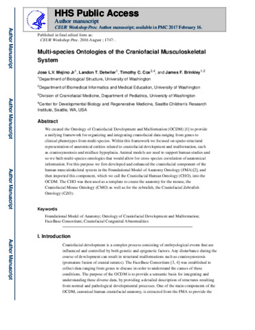 Mejino, Jose L V and Detwiler, Landon T and Cox, Timothy C and Brinkley, James F (2016) Multi-species Ontologies of the Craniofacial Musculoskeletal System. In: Proceedings of the Joint International Conference on Biological Ontology and BioCreative (ICBO). IP03.