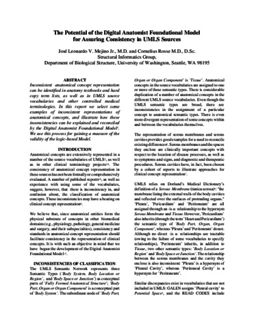Mejino, Jose L V and Rosse, Cornelius (1998) The Potential of the Digital Anatomist Foundational Model for Assuring Consistency in UMLS Sources. In: American Medical Informatics Association Fall Symposium. pp. 825-829.