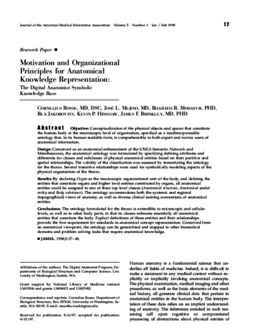 Rosse, Cornelius and Mejino, Jose L V and Modayur, Bharath R and Jakobovits, Rex M and Hinshaw, Kevin P and Brinkley, James F (1998) Motivation and Organizational Principles for Anatomical Knowledge Representation: The Digital Anatomist Symbolic Knowledge Base. Journal of the American Medical Informatics Association, 5 (1). pp. 17-40.